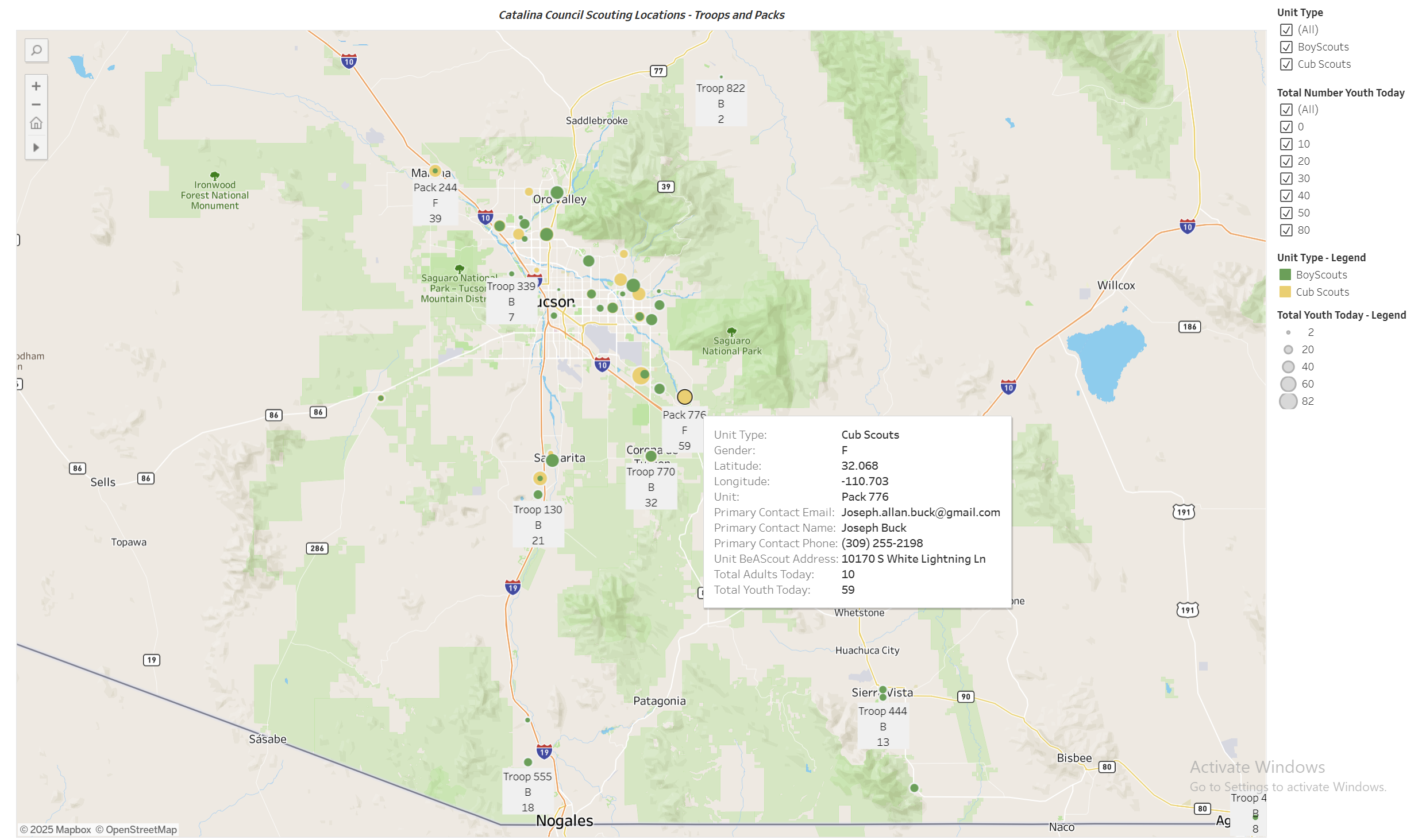 I was approached by the President of Catalina Council's board to use the information they had collected to visualize each BSA Troop's and Cub Scout Pack's locations, along with their relavent information. They used this information to try and help smaller troops/packs to collaborate with other troops/packs towards holding larger and more ambitious events for their kids.