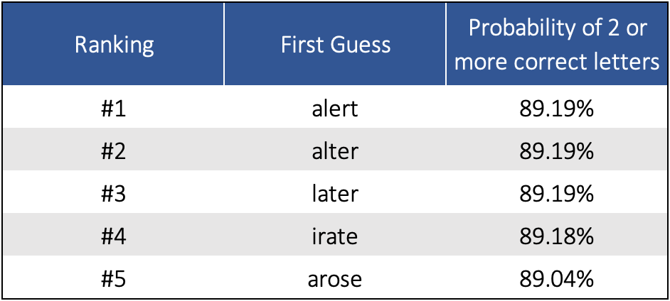 The goal of this challenge is to determine the 5 best starting guesses that gives at least two correct letters and the associated percentage. The calculation was completed using RStudio.